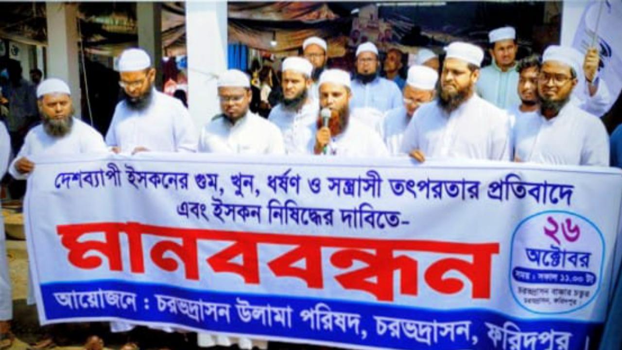 চরভদ্রাসনে ইসকন নিষিদ্ধের দাবিতে উলামা পরিষদের মানববন্ধন