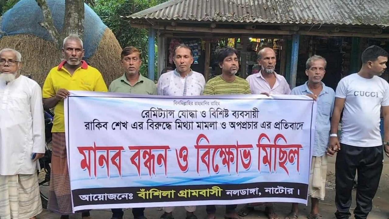 নাটোরের নলডাঙ্গা উপজেলার বাঁশিলা গ্রামে রেমিট্যান্স যোদ্ধা রাকিব শেখের ওপর হাতুরি বাহিনীর হামলা, মিথ্যা মামলা ও অপপ্রচারের প্রতিবাদে মানববন্ধন ও